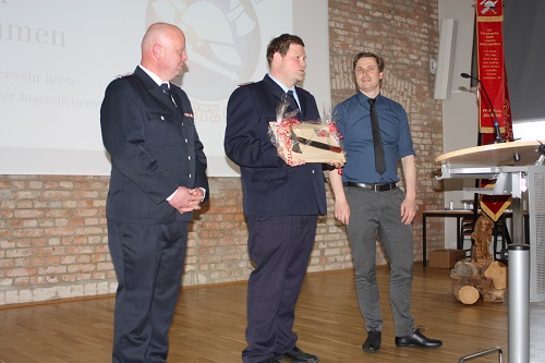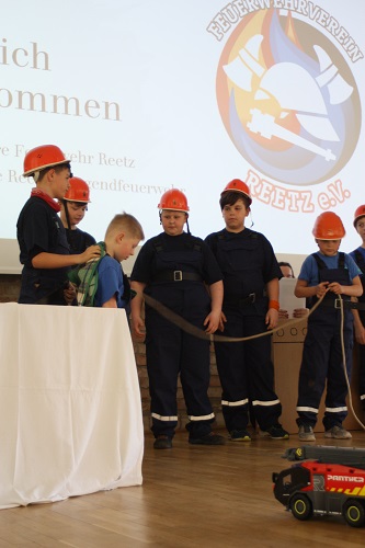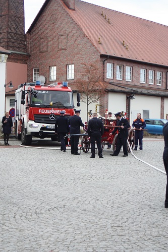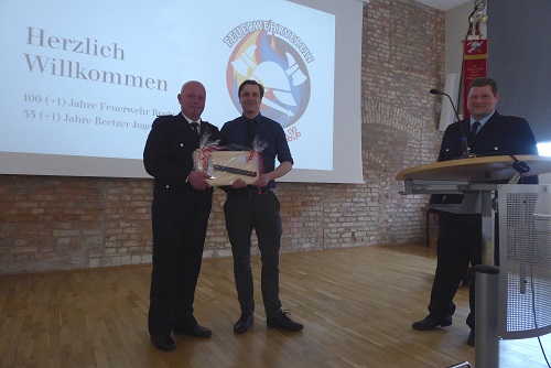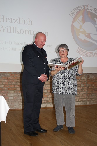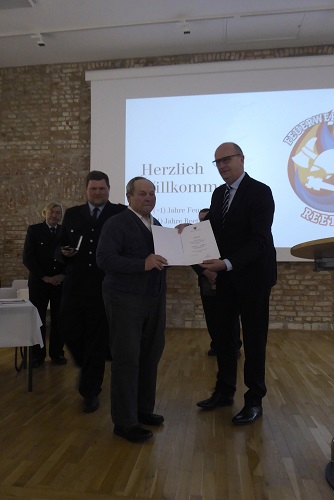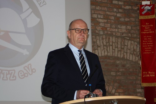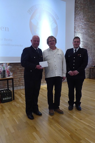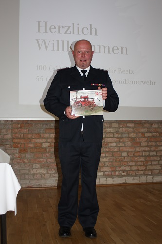 Wie in vielen anderen Dörfern geht auch in Reetz die Gründung auf einen Brand zurück, bei dem die damalige Technik in Form einer Handdruckspritze nicht in Betrieb gebracht werden konnte. Die Druckhebel waren durch Steckbolzen blockiert, welche in der Eile des Einsatzes nicht entfernt wurden. Denn zur damaligen Zeit ging die Brandbekämpfung noch auf die Reihe, also straßenweise von Haus zu Haus, und die Einwohner wurden nur für eine bestimmte Zeit zur Brandbekämpfung verpflichtet. So brannte das Haus nieder und die Reetzer zogen Konsequenzen, indem sie am 21.02.1921 die Freiwillige Feuerwehr Reetz gründeten. Im Laufe der Jahre haben sich viele engagierte Männer und Frauen um die Feuerwehr verdient gemacht. Besonders zu nennen sind dabei in Vertretung für alle Karl-Heinz Krumm und Ernst Großkopf. Letzterer ist auch die Erklärung für Steffen Teubers Engagement, denn er war sein Großvater. „Als ich 1994 in die Feuerwehr eintrat, hätte ich nie gedacht, einmal in die Fußstapfen meines Opas zu treten und heute hier die Festrede zu halten“, so Teuber gerührt.