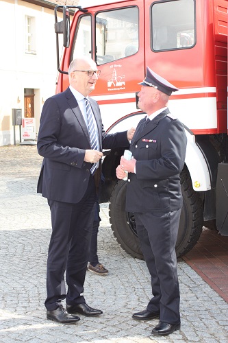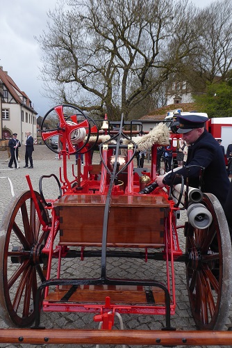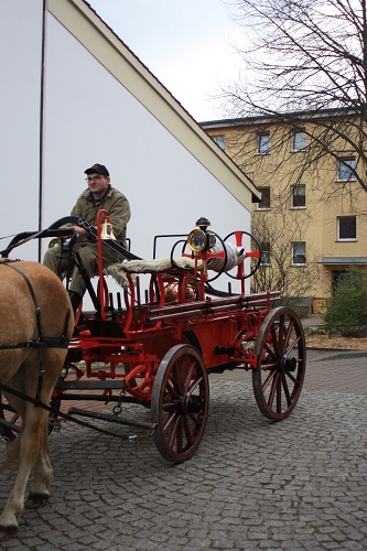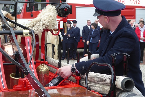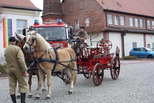 Auch Wiesenburgs Bürgermeister Marco Beckendorf ist stolz auf die Freiwilligen Feuerwehren der Gemeinde. Die Reetzer gehören zu den größten und haben obendrein eine zahlreichen Nachwuchs. Auch wenn er in Steffen Teuber, der auch Gemeindevertreter ist, einen unbequemen Partner hat. „Er schafft es immer wieder, den Finger in die Wunde zu legen“, so Beckendorf. Was aber zum Ergebnis führte, dass in der Gemeinde sämtlich Wehren in den Dörfern erhalten wurden. Reetz, Reetzerhütten und Reppinichen haben sich zusammengeschlossen, alles anderen arbeiten weiter in ihren Orten. Außerdem hat die Gemeinde die bisher größte Investitionsinitiative im Bereich Feuerwehr angeschoben. Dank auch der Unterstützung und Förderung des Landes konnten neue Fahrzeuge und Ausrüstung beschafft werden, auch wenn noch nicht alles da ist. Außerdem gab es eine Reform der Einsatzgelder. Dann rückte Marco Beckendorf mit seinem besonderen Geschenk heraus. Die Reetzer wünschen sich schon lange eine neue Doppelgarage für ihre Ausrüstung. „Wir haben jetzt die Ausschreibung für die Bauplanung getätigt“, überraschten Marco Beckendorf und Gemeindewehrführer Jens-Uwe Werner die Kameraden. „Oh, schon wieder Weihnachten“, freute sich der Ortswehrführer und erinnert sich dabei an das neue Einsatzfahrzeug, welches auch kurz vor Weihnachten in Reetz eintraf. Zwar gebraucht, aber sehr gut in Schuss. Gemeinsam mit RBB-Wetterreporterin Joanna Jambor wurde es damals geputzt und gewienert. Aber nicht nur neue Technik gibt es in Reetz. Die alte Handdruckspritze aus den 1920er Jahren wurde dank Fördermitteln des Ministeriums für Landwirtschaft, Umwelt und Klimaschutz professionell restauriert. Auf der Feier hatte sie ihren – nach der Probe am Vortag, zweiten- Einsatz. Ganz traditionell wurde sie von Pferden auf den Goetheplatz gezogen und vorbereitet. Kräftig musste gepumpt werden, damit Wasser durch den Schlauch läuft. Aber es kam der berühmte Vorführeffekt zum Tragen – nichts passierte. „Aber gestern hat es funktioniert“, si Steffen Teuber schon fast verzweifelt. Aber letztendlich brachten die Kameraden die alte Spritze zum Laufen und gemeinsam mit dem Minister konnte das imaginäre Feuer gelöscht werden. Was wiederum zeigte, wie schwer es die Feuerwehrleute früher hatten.