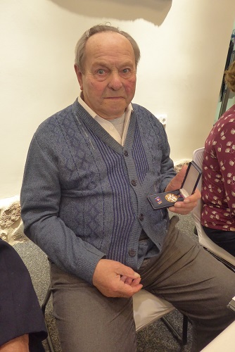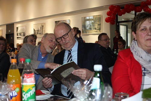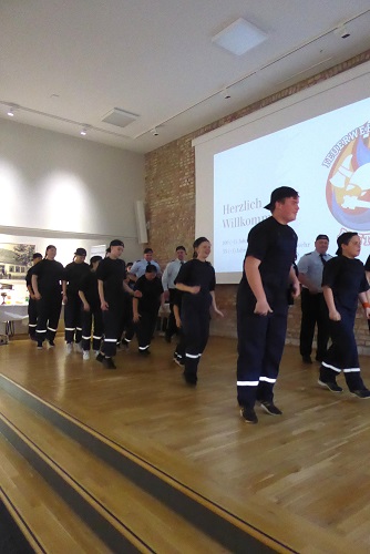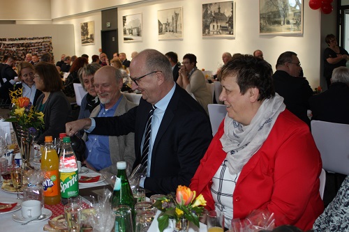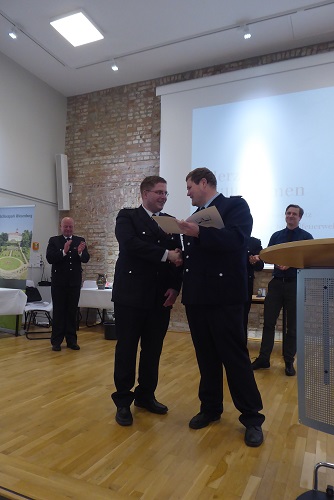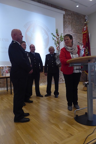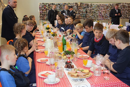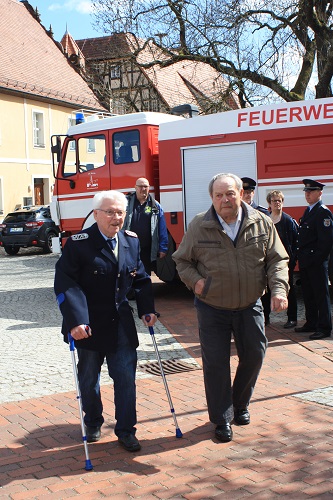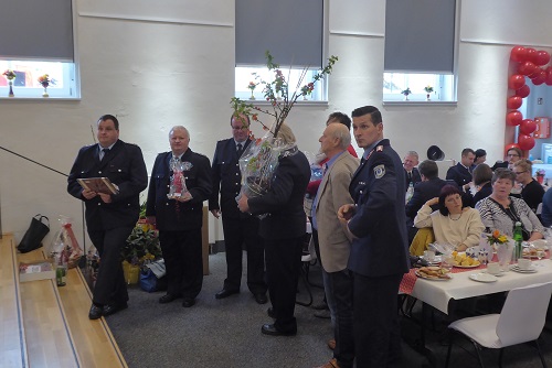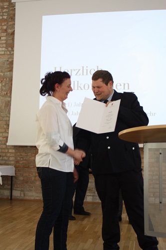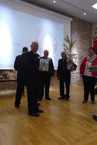 Die Veranstaltung wurde natürlich auch genutzt, um Beförderungen auszusprechen und langjährige Mitglieder zu ehren. Dietmar Woidke ließ es sich nicht nehmen, eine Ehrung persönlich vorzunehmen. Helmut Striebing erhielt die Ehrenmedaille für 60 jährige Mitgliedschaft in der Feuerwehr. Gerührt und überwältigt nahm er die Auszeichnung aus den Händen des Ministers entgegen. Auch die Kinder hatten natürlich etwas vorbereitet. Neben einem gemeinsamen Linedance stellten sie Einsatzszenarien spielrisch nach. Für die Gratulationskur hieß es dann, Schlange stehen. Viele befreundete Wehren waren der Einladung gefolgt und hatten Geschenke dabei. Oft waren es Pflanzen für das Gelände. Wie ein Rhododendron vom Kreisfeuerwehrverband. Denn Rhododendron und Kameradschaft haben etwas gemeinsam, sie bedürfen guter Pflege, um alt zu werden. Ein ganz besonderes Geschenk hatte auch Hobbyimker Mario Binte. Nicht nur, dass er als Helfer dabei war und beide Söhne aktive Mitglieder der Feuerwehr sind, er spendete den Erlös jedes fünften verkauften Honigglases für die Feuerwehr. Über den genauen Betrag wurde jedoch Stillschweigen vereinbart. Und wer nun noch nicht genug Emotionen hatte, bekam noch eine tränenreiche geliefert, jedoch waren es diesmal Freudentränen. Denn Steffen Teuber nutze die Gelegenheit und machte seiner langjährigen Lebensgefährtin und Kameradin Dana einen Heiratsantrag.