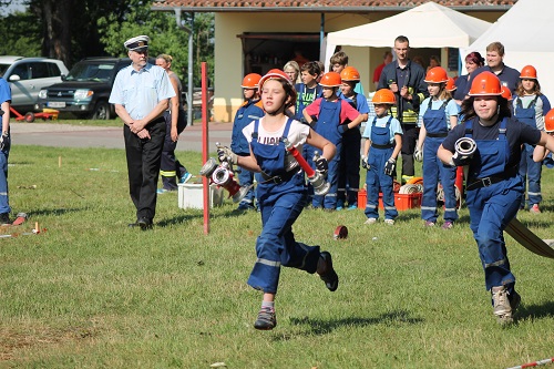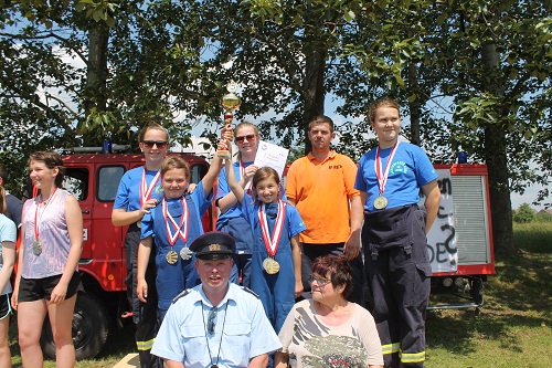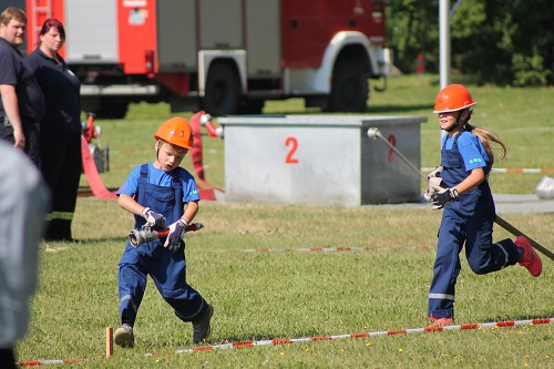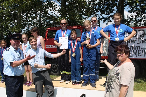 Gleichzeitig mit dem 14. Gemeindefeuerwehrtag begeht die Reetzer Ortswehr auch 2 Jubiläen, den 95. Geburtstag der Ortswehr und den 50 Geburtstag der Kinder- und Jugendwehr. Diese hat derzeit 23 Mitglieder und wird von den Jugendwarten Yvonne und Michael Bolz mit großem Engagement betreut. Inzwischen sind auch Kinder aus anderen Ortsteilen dort Mitglied. Die Kinder und Jugendlichen erwartete eine besondere Überraschung. Anlässlich des Jubiläums erhielten sie neue T-Shirts. Die konnten sie auch gleich zeigen, denn Gemeindewehrführer Burkhard Brüning erlaubte auf Grund der Hitze einen Start ohne Jacken. Zusätzlich versprach Ortschefin Marion Gante 300 Euro als Geschenk. Auch bei den Wettkämpfen war zu merken, welch gute Arbeit die Jugendwarte geleistet haben. Es gab keine Disziplin, bei der die Kinder und Jugendlichen aus Reetz nicht auf dem Podest standen. Besonders die Jüngsten waren megastolz auf ihre Medaillen und Pokale.