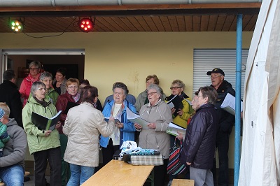 Feuerwehr und andere Helfer den Baum aufrichteten. Die Singegemeínschaft