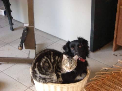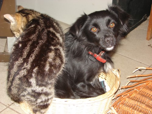 Blacky teilt sich brüderlich das Körbchen mit Kater Willi.