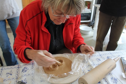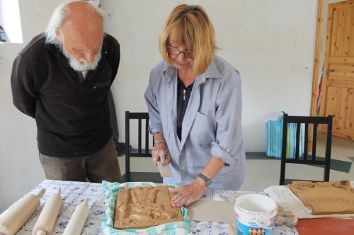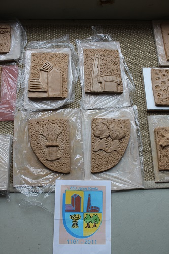 Das Reetzer Wappen in Ton ist unter anderem ein Ergebnis der Veranstaltung „Aktiv sein im Alter“ in Reetz. Es wurde bereits in Fredersdorf erfolgreich durchgeführt. So kamen Brigitte Heßler und Ute Paulmann-Boll, letztere wohnt in Reetz, auf den Gedanken, man könne das auch in Reetz machen. Der Verein „OELALA“ übernahm die Trägerschaft, so dass der Landkreis das Projekt bewilligte. Unter Anleitung von Brigitte Hessler ( Keramikerin) und Ute Paulmann-Boll wurden Geschehnisse und Motive des Dorfes (auch Tiere, Bäume, Pflanzen)von den Projektteilnehmern gesammelt und auf Tonfliesen getöpfert. Claus Wichmann hatte die blendende Idee, das Reetzer Wappen in Ton zu verewigen. Andere, wie Heidemarie Kallenbach, die übrigens das erste Mal mit Ton arbeitet, beschäftigten sich mit ehemaligen Gewerken und Firmen in Reetz. Brigitte Heßler selbst fertigte eine Fliese mit dem Ringbrandofen der alten Ziegelei, Ute Paulmann-Boll wollte unbedingt noch die Motocrossveranstaltungen festhalten. Dass nicht unbedingt viele Teilnehmer da waren, war nicht unbedingt ein Nachteil. „So konnte ich mich intensiver kümmern“, sagte Brigitte Heßler. Die Fliesen werden jetzt gebrannt und können anschließend im Dorf angebracht werden. Wo, ist jedoch noch nicht klar. Man könnte damit die Fassade der zukünftigen Heimatstube gestalten, so die Vorsitzende des Dorfvereins Eva Loth. Sie wird diesen Vorschlag auf der nächsten Vereinssitzung den Mitgliedern unterbreiten. Dazu wäre es schön, wenn man noch mehr Fliesen fertigen würde. Da im September ein Herbstfest geplant ist, könnte man dort noch einmal werkeln. Dann entsteht ein individuelles Kunstwerk, das sich durch die Vielzahl der Tonfliesen zu einem Gesamtbild des Dorfes zusammen fügt. Der Untergrund wird dann für die Fliesen vorbereitet, diese werden von einem Fliesenleger angebracht und ausgefugt. Die Kosten dafür sind im Projekt mit enthalten.