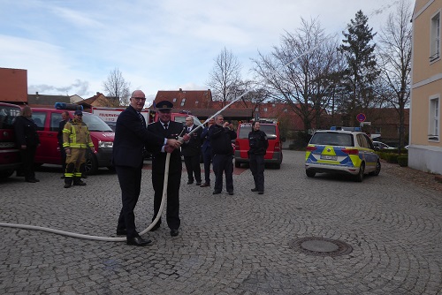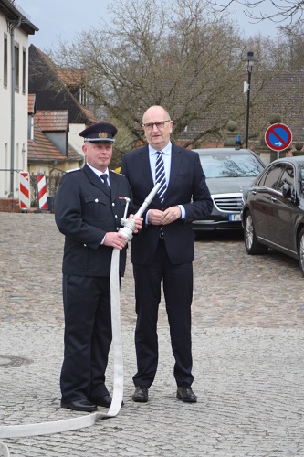 Auch Wiesenburgs Bürgermeister Marco Beckendorf ist stolz auf die Freiwilligen Feuerwehren der Gemeinde. Die Reetzer gehören zu den größten und haben obendrein eine zahlreichen Nachwuchs. Auch wenn er in Steffen Teuber, der auch Gemeindevertreter ist, einen unbequemen Partner hat. „Er schafft es immer wieder, den Finger in die Wunde zu legen“, so Beckendorf. Was aber zum Ergebnis führte, dass in der Gemeinde sämtlich Wehren in den Dörfern erhalten wurden. Reetz, Reetzerhütten und Reppinichen haben sich zusammengeschlossen, alles anderen arbeiten weiter in ihren Orten. Außerdem hat die Gemeinde die bisher größte Investitionsinitiative im Bereich Feuerwehr angeschoben. Dank auch der Unterstützung und Förderung des Landes konnten neue Fahrzeuge und Ausrüstung beschafft werden, auch wenn noch nicht alles da ist. Außerdem gab es eine Reform der Einsatzgelder. Dann rückte Marco Beckendorf mit seinem besonderen Geschenk heraus. Die Reetzer wünschen sich schon lange eine neue Doppelgarage für ihre Ausrüstung. „Wir haben jetzt die Ausschreibung für die Bauplanung getätigt“, überraschten Marco Beckendorf und Gemeindewehrführer Jens-Uwe Werner die Kameraden. „Oh, schon wieder Weihnachten“, freute sich der Ortswehrführer und erinnert sich dabei an das neue Einsatzfahrzeug, welches auch kurz vor Weihnachten in Reetz eintraf. Zwar gebraucht, aber sehr gut in Schuss. Gemeinsam mit RBB-Wetterreporterin Joanna Jambor wurde es damals geputzt und gewienert. Aber nicht nur neue Technik gibt es in Reetz. Die alte Handdruckspritze aus den 1920er Jahren wurde dank Fördermitteln des Ministeriums für Landwirtschaft, Umwelt und Klimaschutz professionell restauriert. Auf der Feier hatte sie ihren – nach der Probe am Vortag, zweiten- Einsatz. Ganz traditionell wurde sie von Pferden auf den Goetheplatz gezogen und vorbereitet. Kräftig musste gepumpt werden, damit Wasser durch den Schlauch läuft. Aber es kam der berühmte Vorführeffekt zum Tragen – nichts passierte. „Aber gestern hat es funktioniert“, si Steffen Teuber schon fast verzweifelt. Aber letztendlich brachten die Kameraden die alte Spritze zum Laufen und gemeinsam mit dem Minister konnte das imaginäre Feuer gelöscht werden. Was wiederum zeigte, wie schwer es die Feuerwehrleute früher hatten.