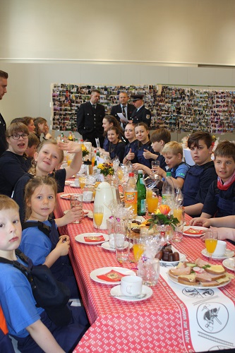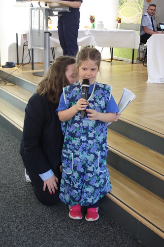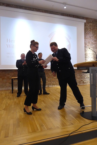 Die Veranstaltung wurde natürlich auch genutzt, um Beförderungen auszusprechen und langjährige Mitglieder zu ehren. Dietmar Woidke ließ es sich nicht nehmen, eine Ehrung persönlich vorzunehmen. Helmut Striebing erhielt die Ehrenmedaille für 60 jährige Mitgliedschaft in der Feuerwehr. Gerührt und überwältigt nahm er die Auszeichnung aus den Händen des Ministers entgegen. Auch die Kinder hatten natürlich etwas vorbereitet. Neben einem gemeinsamen Linedance stellten sie Einsatzszenarien spielrisch nach. Für die Gratulationskur hieß es dann, Schlange stehen. Viele befreundete Wehren waren der Einladung gefolgt und hatten Geschenke dabei. Oft waren es Pflanzen für das Gelände. Wie ein Rhododendron vom Kreisfeuerwehrverband. Denn Rhododendron und Kameradschaft haben etwas gemeinsam, sie bedürfen guter Pflege, um alt zu werden. Ein ganz besonderes Geschenk hatte auch Hobbyimker Mario Binte. Nicht nur, dass er als Helfer dabei war und beide Söhne aktive Mitglieder der Feuerwehr sind, er spendete den Erlös jedes fünften verkauften Honigglases für die Feuerwehr. Über den genauen Betrag wurde jedoch Stillschweigen vereinbart. Und wer nun noch nicht genug Emotionen hatte, bekam noch eine tränenreiche geliefert, jedoch waren es diesmal Freudentränen. Denn Steffen Teuber nutze die Gelegenheit und machte seiner langjährigen Lebensgefährtin und Kameradin Dana einen Heiratsantrag.