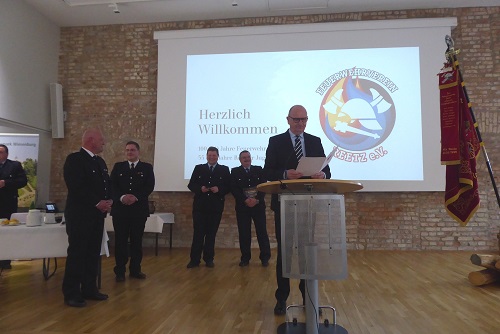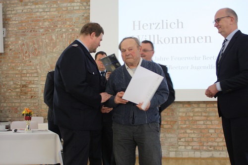 Wie in vielen anderen Dörfern geht auch in Reetz die Gründung auf einen Brand zurück, bei dem die damalige Technik in Form einer Handdruckspritze nicht in Betrieb gebracht werden konnte. Die Druckhebel waren durch Steckbolzen blockiert, welche in der Eile des Einsatzes nicht entfernt wurden. Denn zur damaligen Zeit ging die Brandbekämpfung noch auf die Reihe, also straßenweise von Haus zu Haus, und die Einwohner wurden nur für eine bestimmte Zeit zur Brandbekämpfung verpflichtet. So brannte das Haus nieder und die Reetzer zogen Konsequenzen, indem sie am 21.02.1921 die Freiwillige Feuerwehr Reetz gründeten. Im Laufe der Jahre haben sich viele engagierte Männer und Frauen um die Feuerwehr verdient gemacht. Besonders zu nennen sind dabei in Vertretung für alle Karl-Heinz Krumm und Ernst Großkopf. Letzterer ist auch die Erklärung für Steffen Teubers Engagement, denn er war sein Großvater. „Als ich 1994 in die Feuerwehr eintrat, hätte ich nie gedacht, einmal in die Fußstapfen meines Opas zu treten und heute hier die Festrede zu halten“, so Teuber gerührt.