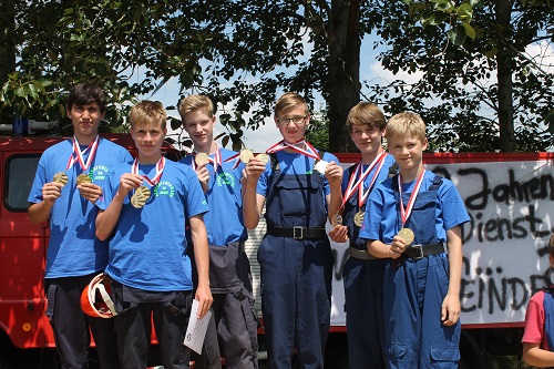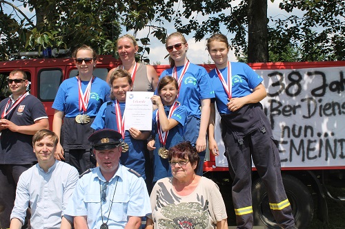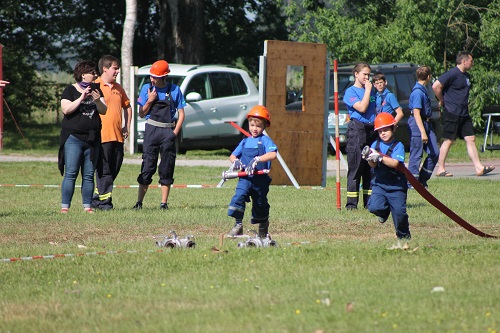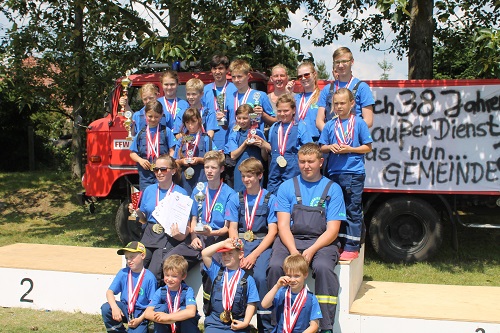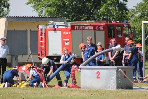 Gleichzeitig mit dem 14. Gemeindefeuerwehrtag begeht die Reetzer Ortswehr auch 2 Jubiläen, den 95. Geburtstag der Ortswehr und den 50 Geburtstag der Kinder- und Jugendwehr. Diese hat derzeit 23 Mitglieder und wird von den Jugendwarten Yvonne und Michael Bolz mit großem Engagement betreut. Inzwischen sind auch Kinder aus anderen Ortsteilen dort Mitglied. Die Kinder und Jugendlichen erwartete eine besondere Überraschung. Anlässlich des Jubiläums erhielten sie neue T-Shirts. Die konnten sie auch gleich zeigen, denn Gemeindewehrführer Burkhard Brüning erlaubte auf Grund der Hitze einen Start ohne Jacken. Zusätzlich versprach Ortschefin Marion Gante 300 Euro als Geschenk. Auch bei den Wettkämpfen war zu merken, welch gute Arbeit die Jugendwarte geleistet haben. Es gab keine Disziplin, bei der die Kinder und Jugendlichen aus Reetz nicht auf dem Podest standen. Besonders die Jüngsten waren megastolz auf ihre Medaillen und Pokale.