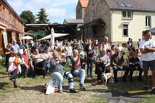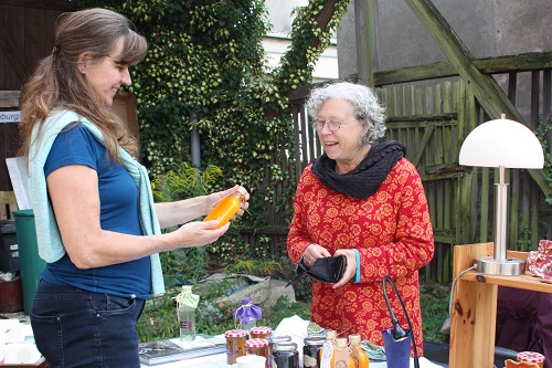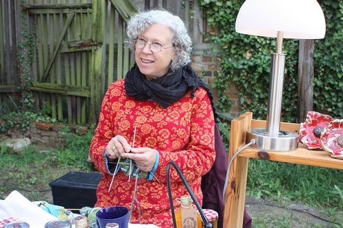 Auf dem Sensthof herrschte Trubel und Fröhlichkeit. An verschiedenen Ständen gab es handwerkliches und kulinarisches. Die Mitglieder des OELALA Vereins und drei Reetzer Frauen hatten leckeren Kuchen gebacken und alle Vorbereitungen für die traditionelle Pizza und den Veggie-Burger getroffen. Auch Magda Brienza aus Wiesenburg war wieder dabei. Neben ihre Socken mit Kuschelferse, an denen sie auch während der Reetzivals strickte, hatte sie Spezialitäten aus der Wachau in Österreich dabei, wo ihr Sohn lebt und arbeitet. So fiel der Marillenlikör mit Chili alles sofort auf, ebenso die Marillenmarmelade mit Kernen (aus diesen wird normalerweise Persipan hegestellt) und die schwarzen Walnüsse. All das kann man auch bei ihr zu Hause in Wiesenburg erwerben.