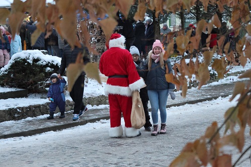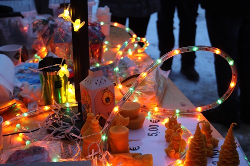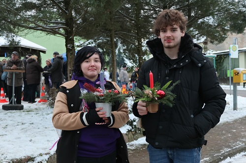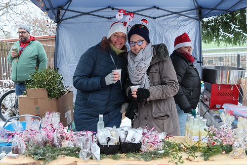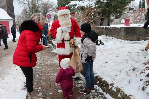 Offiziell eröffnet wurde der Adventsmarkt dann von den Jagdhornbläsern. Inzwischen buken die Kita und Ronny Herbke bereits die ersten Waffeln. Immerhin acht Kilo Mehl wurden dafür verarbeitet und es wurde auch alles ratzekahl leer. Im Feuerwehrhaus konnten wieder mit Unterstützung von Anett Blasche, Inhaberin der Gärtnerei Köhler, Weihnachtsgestecke gebastelt werden. Auch wenn es in diesem Jahr nicht ganz so viele Stände waren – es waren durch die verkürzte Adventszeit überall Weihnachtsmärkte – die Standbetreiber waren zufrieden. „Strickfee“ Marion Herrmann hatte in weiser Voraussicht viele Mützen und Schals dabei, die reißenden Absatz fanden. „Dafür gingen Socken in diesem Jahr nicht“, schmunzelte sie. Auch Familie Binte konnte einen Großteil ihres Honigs an den Mann bzw. an die Frau bringen. Bei dieser Witterung ist ein Glas heiße Milch mit Honig ein optimales Getränk. Es gab gebrannte Mandeln, Plätzchen, Schokofrüchte und viele kleine Geschenkideen. Und auch der Weihnachtsmann kam natürlich. Felix Opitz schlüpft seit Jahren in das Kostüm. Am späten Nachmittag gab es jedoch ein Raunen auf dem Platz. Felix spazierte in Zivil über den Platz, aber trotzdem war ein Weihnachtsmann da. Alles rätselte, wer das wohl ist. Die Erklärung war einfach – Papa Dieter Glinke wollte auch mal den Weihnachtsmann spielen.