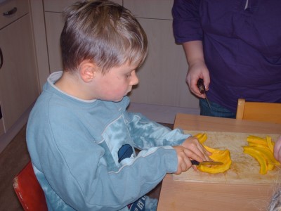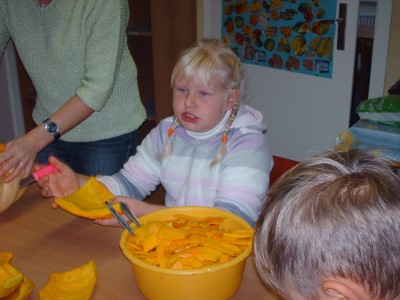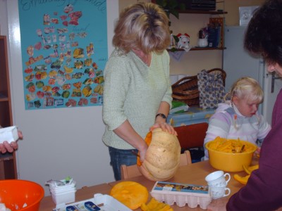 Omas, Kürbissuppe gekocht und Teig für den Knüppelkuchen geknetet. Unter