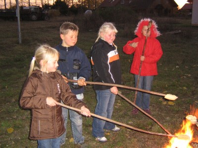 sich bereits die Feuerwehr um das Lagerfeuer, das für den Knüppelkuchen