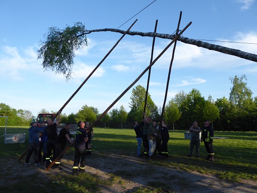 Die Suche nach einer grünen Maie war in diesem Jahr eine der leichtesten Übungen der Kameraden der Reetzer Freiwilligen Feuerwehr. Das sonnige Wetter hat die Blätter sprießen lassen. So ging es nach der Arbeit am Vorabend des 1. Mai nach Absprache mit dem zuständigen Förster in den Wald, um den Maibaum zu holen. Inzwischen hat sich das Maibaumaufstellen in Reetz zu einem kleinen Vorgeschmack auf das Dorffest entwickelt. Viele Einwohner und besonders die Kinder warteten gespannt auf den Traktor mit dem Maibaum. Vorab durften die schon einmal in die Wundertüte von Ortschefin Marion Gante greifen, die mit Gummibärchen und Kaubonbons gefüllt war. Sozusagen zur Stärkung. Die Jüngsten durften diesen nämlich wieder mit bunten Bändern schmücken, ehe er mit vereinten Kräften und einem ausgeklügelten System aufgerichtet wurde. Nachdem die Maie unter großem Hallo in die Senkrechte gebracht wurde, begrüßte die Reetzer Singegemeinschaft offiziell den Frühling mit Frühlingsliedern zum Mitsingen. Und auch sonst war alles für ein kleines fest vorbereitet. Die Feuerwehr sorgte für leckeres vom Grill und hatte außerdem eine zünftige Bowle gezaubert. Die Kinder warteten jedoch schon gespannt an der Feuerschale. In diesem Jahr gab es erstmals Knüppelkuchen.