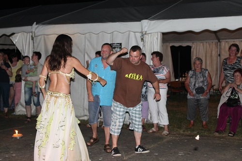 Bollywood in Reetzerhütten! Wer diesmal nicht beim Dorffest war, hat echt etwas verpasst. Der Ortsvorstand wollte in diesem Jahr mal etwas Besonderes bieten. Die Idee mit einer Bauchtänzerin hatte Angela Hahne. „Es war gar nicht so leicht, eine gute Künstlerin zu finden“ erzählte sie. Stundenlang habe man sich Videos bei Youtube angesehen. Und stieß so auf die Seite von Zeyna. Die junge Frau ging nach ihrem Studium an der Sporthochschule Köln direkt nach Kairo, um dort Unterricht im Bauchtanz zu nehmen. Anschließend arbeitete sie sowohl in Rom als auch in Zürich. Die professionelle Ausbildung war dem Auftritt anzusehen. Vor allem verstand sie es, das Publikum zum Mitmachen zu animieren. Was bei den Zuschauern Begeisterung und viel Beifall hervorrief. Während die Frauen begeistert mitmachten, zierten sich die Männer teilweise wie die „Zicke am Strick“. Da half auch nicht unbedingt, dass Ortsvorsteher Klaus-Peter Klenke den Vorreiter spielte. Letzterer war anfangs etwas skeptisch, so einen Vortrag für das Dorffest zu engagieren, gab aber hinterher zu, dass es eine super Idee war. Auch das Wetter spielte in diesem Jahr mit. Der schon fast obligatorische Regenschauer hatte sich auf die Mittagszeit verlagert, so dass bei Sonnenschein aber auch schwülen Temperaturen begonnen werden konnte. Die Hüpfburg für die Kleinen wurde vorsichtshalber mit Tüchern ausgelegt, da sich das Material ziemlich aufgeheizt hatte. Ungeduldig warteten die Kinder auf die Ankunft der Pferde von der Triple-D Ranch und stritten sich fast darum, wer als erster eine Runde reiten durfte. Auch das Feuerwehrauto stand wieder für Rundfahrten mit Tatü Tata bereit. Beim amerikanisch Kegeln und Schießen konnte tolle Preise abgeräumt werden, zu Kaffee und Kuchen gab es zünftige Blasmusik. Gegen 22 Uhr kamen dann doch noch so einige Regentropfen. Aber die Reetzerhüttener ließen sich davon nicht beeindrucken – man sei es ja gewöhnt, so die meisten. Bei guter Discomusik von DJ Kerze (alias Christian Buchal) füllte sich die Tanzfläche und bei den immer noch warmen Temperaturen war der Regen schon fast eine willkommene Abkühlung!