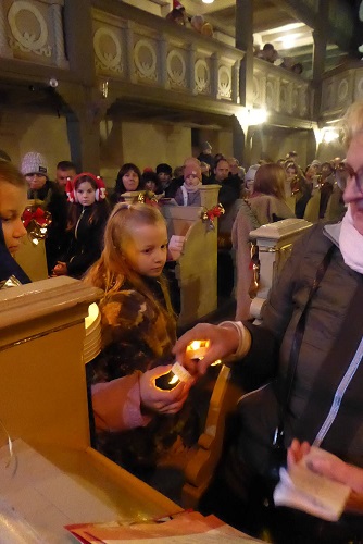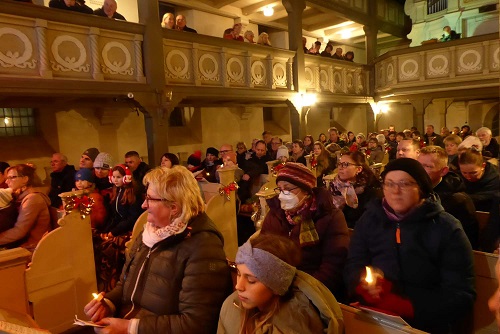 Es war ein relativ kurzer, familienfreundlicher Gottesdienst. Die Kinder begrüßten die Gäste am Eingang der Kirche und verteilten die Liedhefte. Es wurden gemeinsam Weihnachtslieder gesungen. Mit Begeisterung waren die Kinder beim Krippenspiel dabei. Die Reetzer Kirche war sehr gut besucht, auch die Emporen waren besetzt. Kurz vor Ende verteilten die Kinder Friedenslichter an die Anwesenden. Diese spielten auch eine Rolle in der Fürbitte, besonders vor dem Hintergrund der Kriegsschauplätze auf der Welt. Mit dieser schönen halben Stunde konnten sich alle auf den Heiligen Abend und die Bescherung einstimmen.