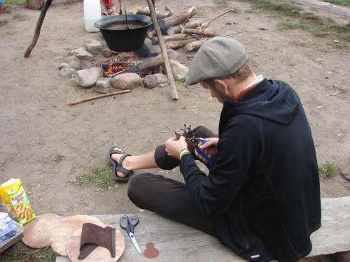 Material mit, so dass Lederbeutel und Holzschalen hergestellt werden